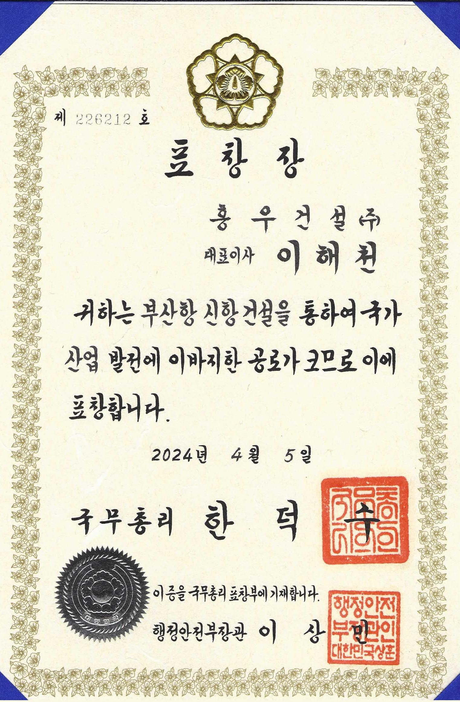 흥우건설(주) 이해천 대표이사 국무총리 표창